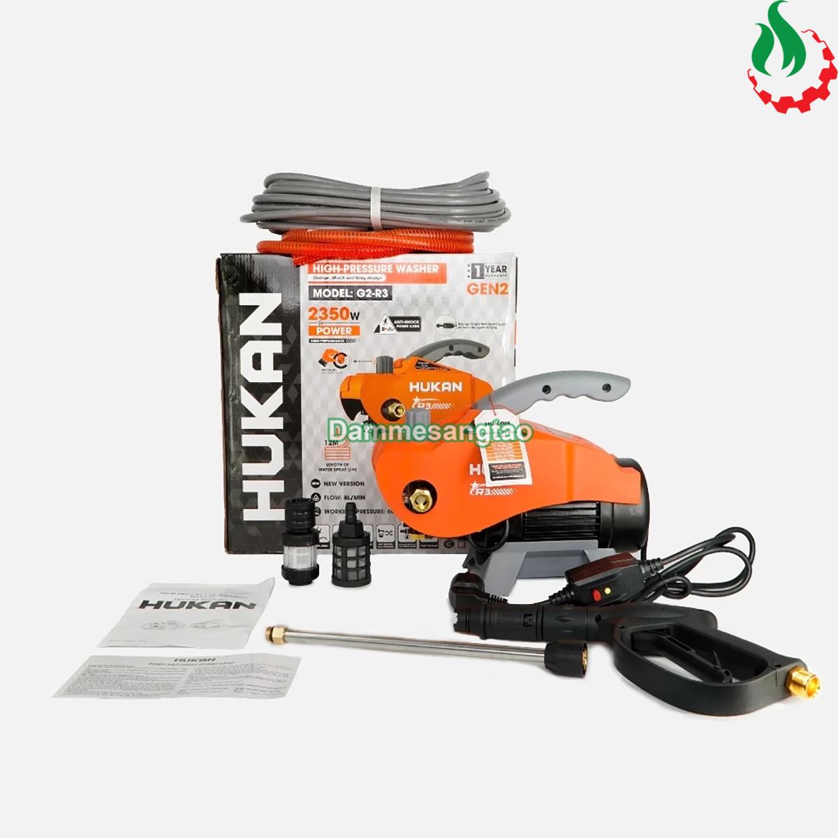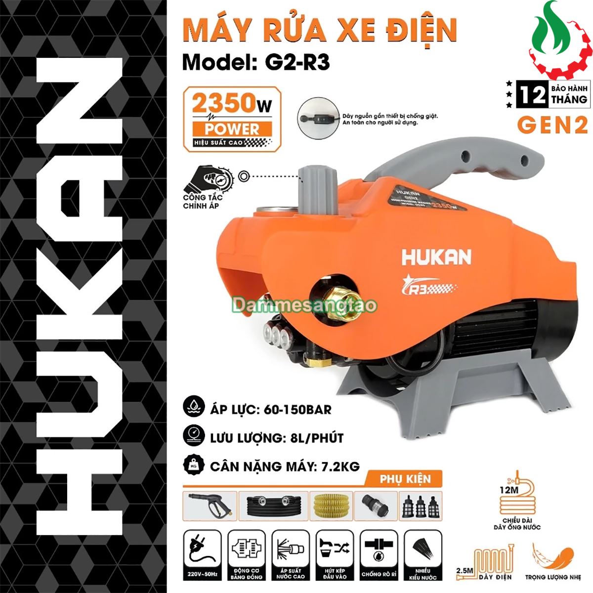 - Tên sản phẩm: Máy rửa xe chỉnh áp HUKAN G2-R3, 2350W, Động cơ không chổi than, Áp lực 150Bar, Có ÁT CHỐNG GIẬT