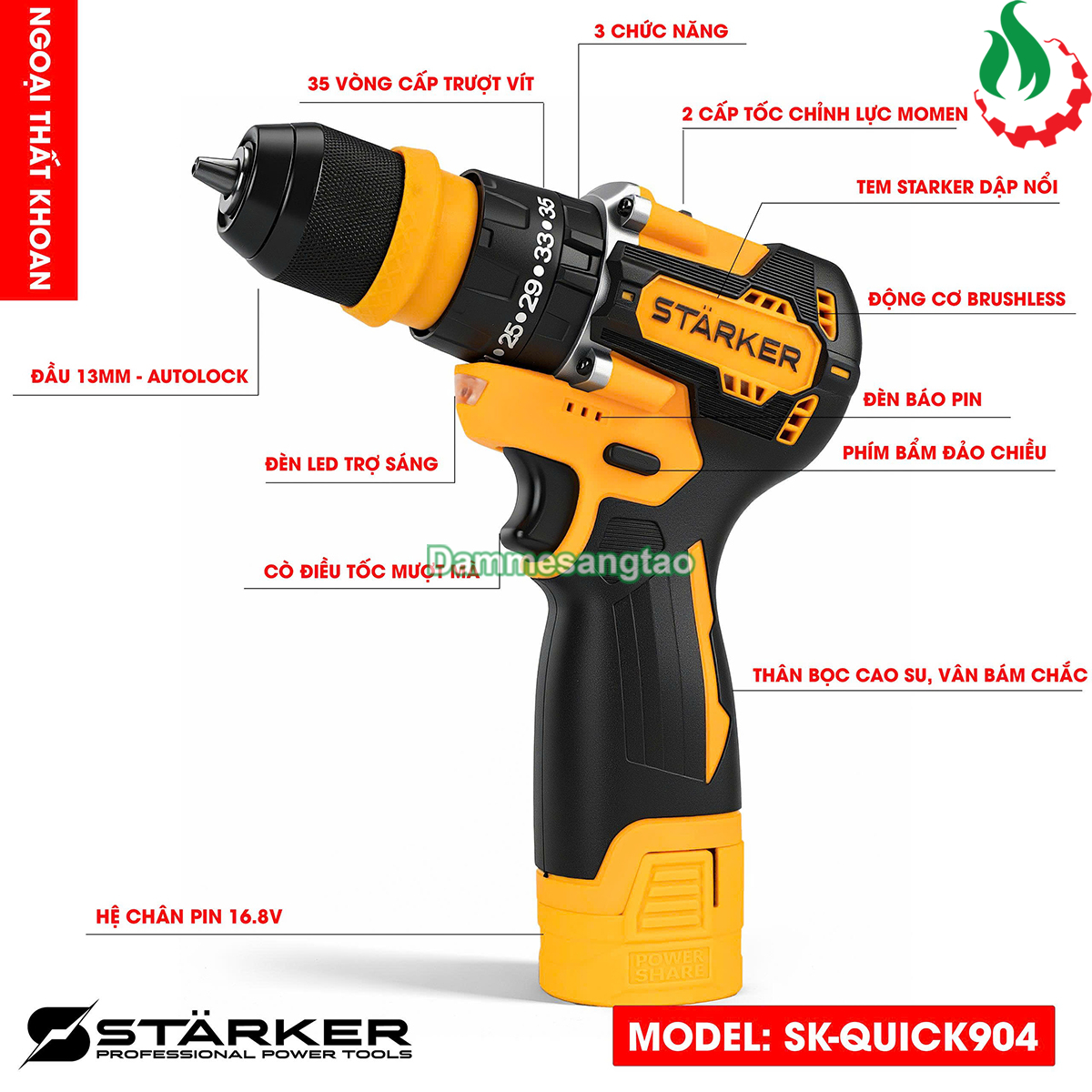 - Máy khoan pin 16,8v STARKER đầu kẹp 10mm (Bao gồm 2 pin + 1 sạc ).