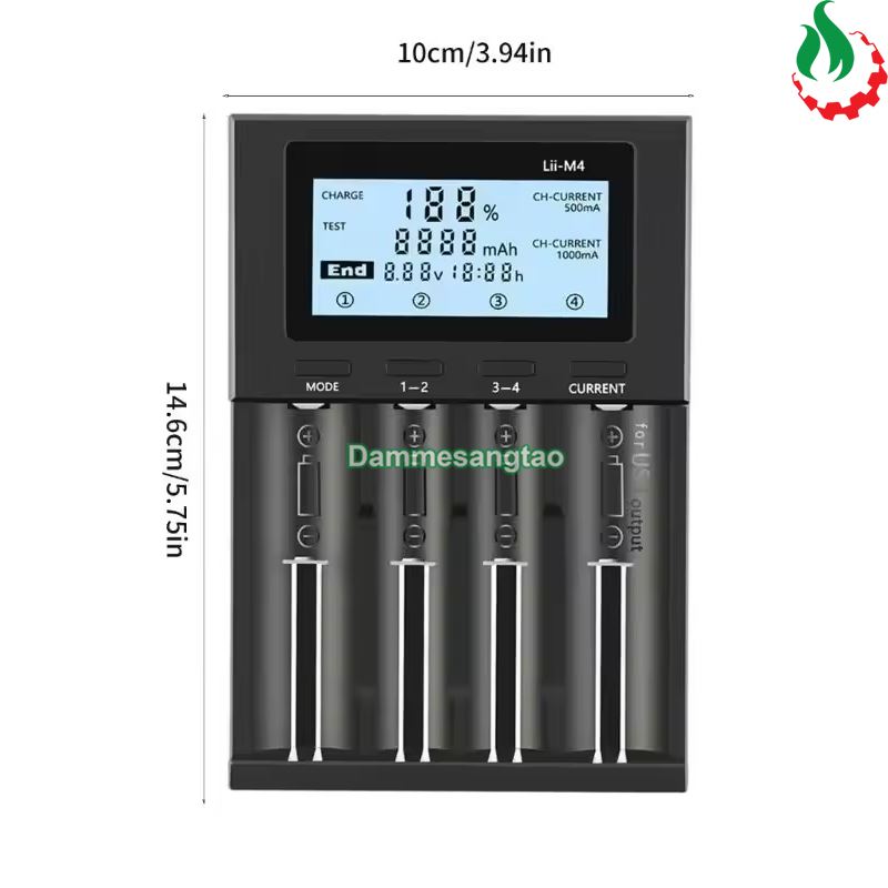 - Bộ Sạc Pin Đa Năng Liitokala Lii-M4 có thể sạc được đa số loại khác nhau của pin lithium, Li-ion, pin AA AAA, pin nickel-hydrogen, các loại pin sạc, pin 26650, 21700, 18500, 18490,18350, 17670, 14500, 10440, 16340 (RCR123).