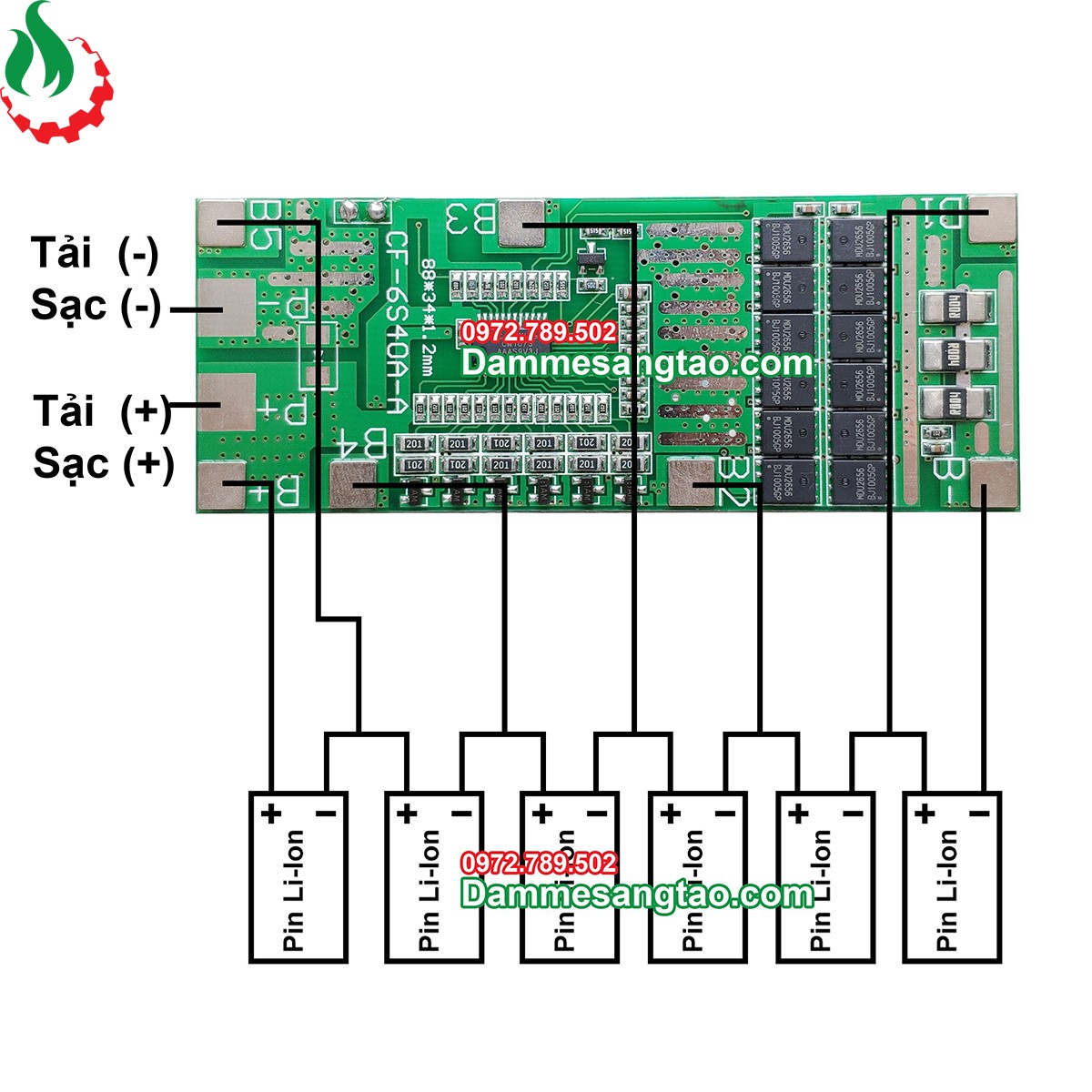 - Số cell sử dụng: 6 cell Li-ion hoặc 6 cặp cell (12 cell) Li-ion mắc nối tiếp, thậm chí nhiều hơn nữa (18, 24 cell,...), tùy vào nhu cầu và diện tích vỏ pin mà có thể lắp nhiều cell song song hơn để có công suất cũng như dòng tải pin lớn hơn.