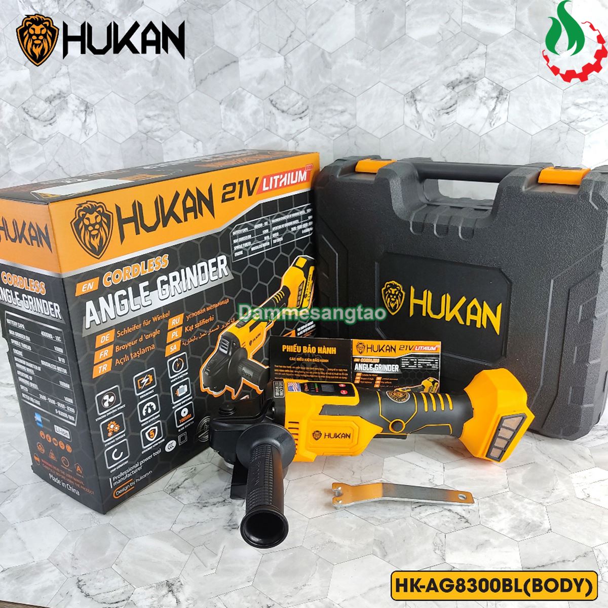 - Full bộ Hukan bao gồm: 1 Thân máy mài pin 21V Hukan HK-AG8300BL, 2 Pin Hukan 10cell 4AH, 1 Sạc adapter Hukan.