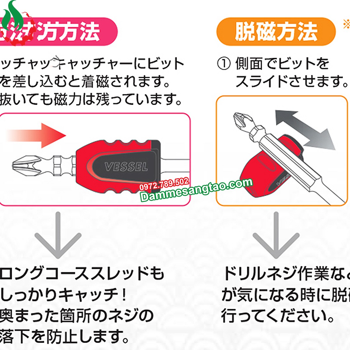 - Sản phẩm giúp tăng từ tính cho các mũi vít thông dụng bằng cách gắn vào mũi vít trực tiếp qua lỗ trên sản phẩm.