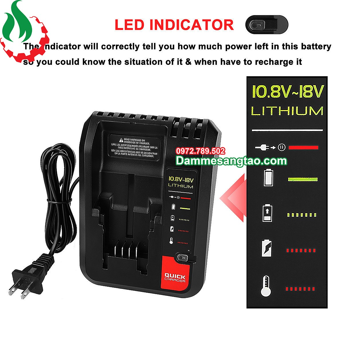 - Sử dụng: Sạc cho pin Black & Decker 10.8V - 14.4v - 18v Li-ion