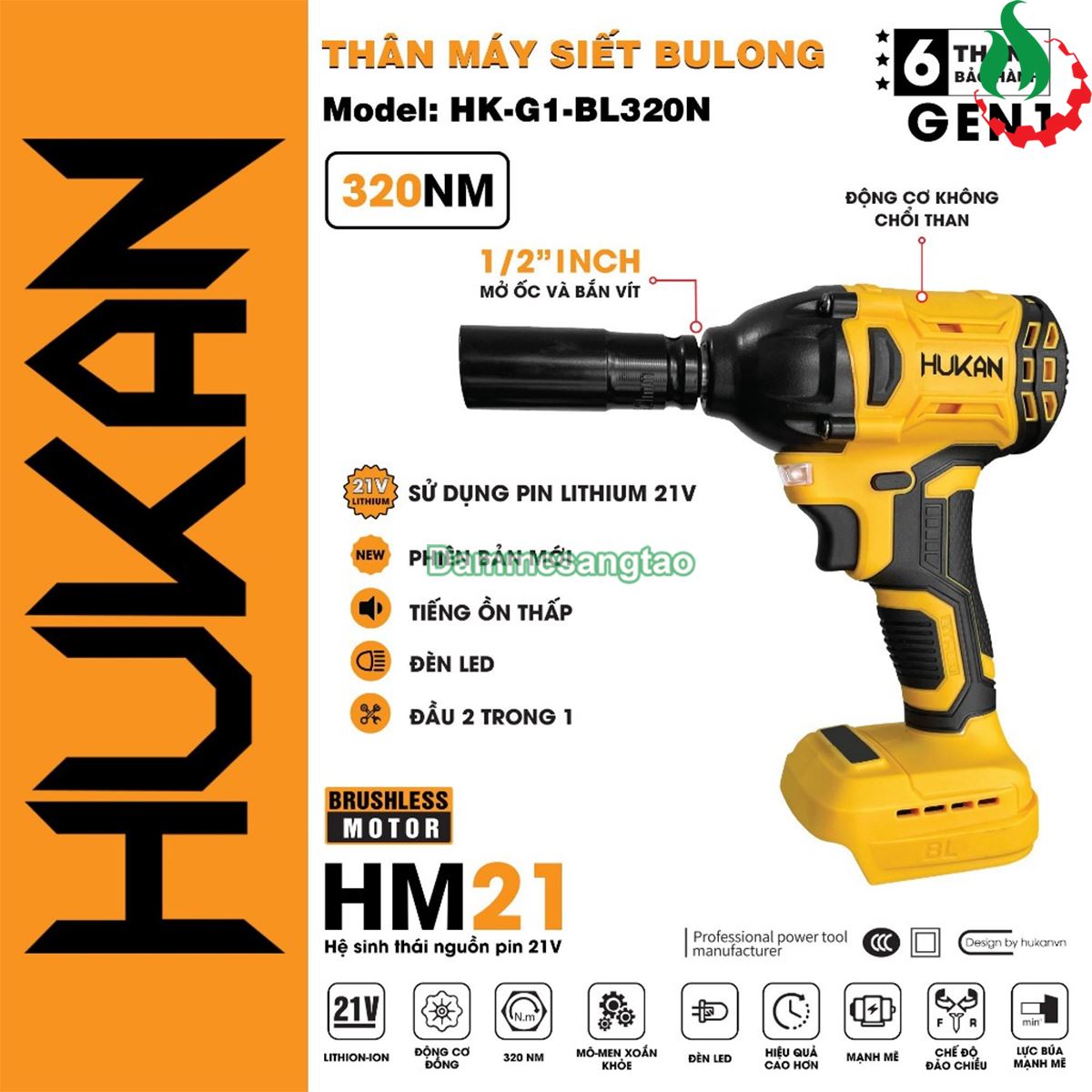 Máy siết bulong pin 21V Hukan HK-G1-BL320N 320Nm (Không chổi than)