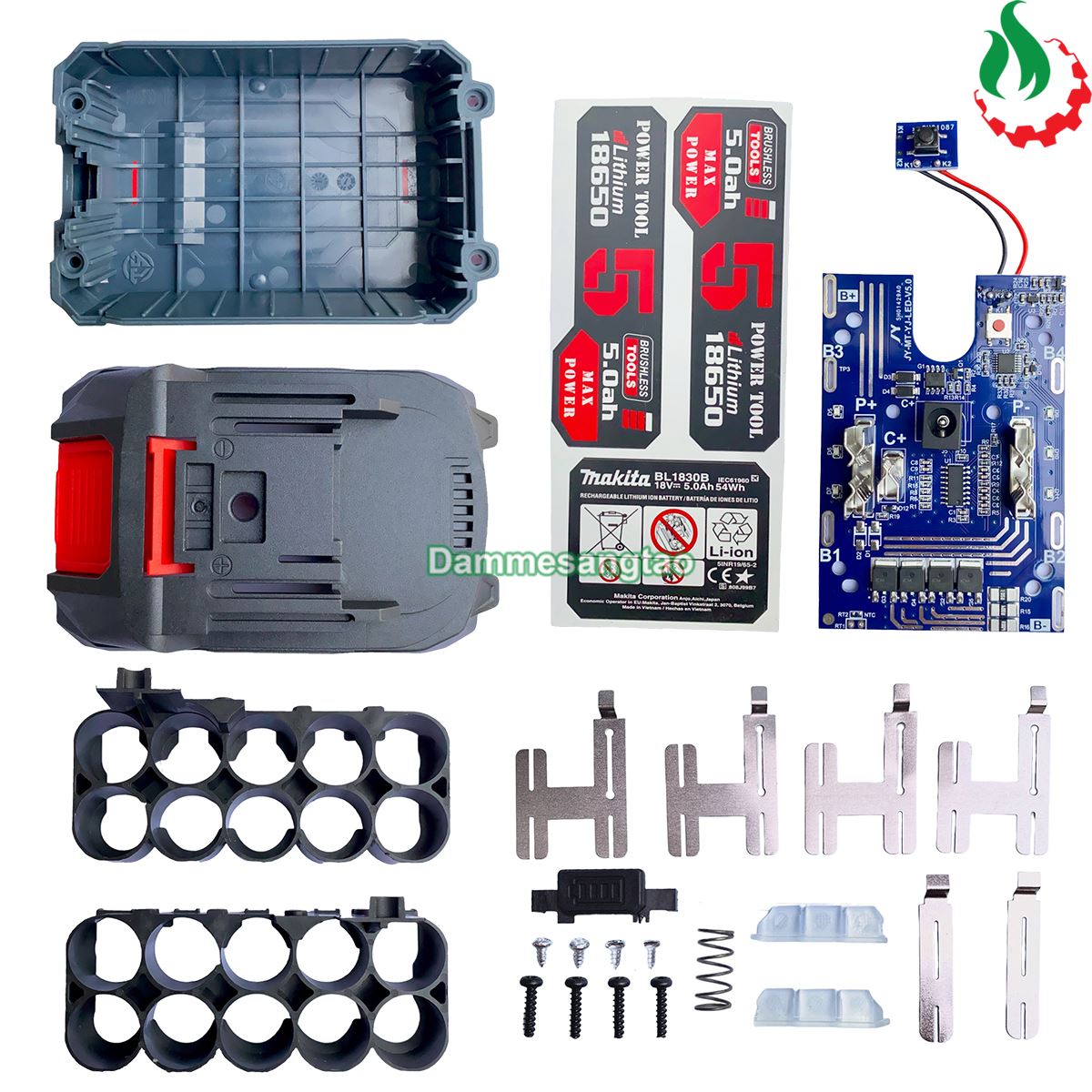 - Sẩm phẩm bao gồm: Vỏ pin, khung pin, ốc vít , lò xo, lẫy nhựa, nút báo pin, kẽm, decal, mạch bảo vệ pin