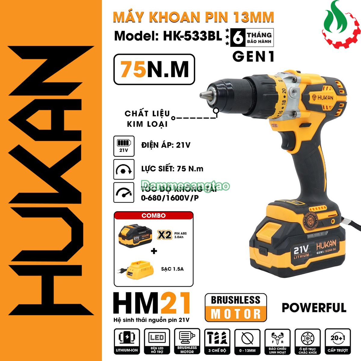 - Tên sản phẩm: Máy khoan pin HUKAN HK-533BL, Không chổi than, Lực siết 75Nm, 3 chức năng 13 ly, Có khóa trục